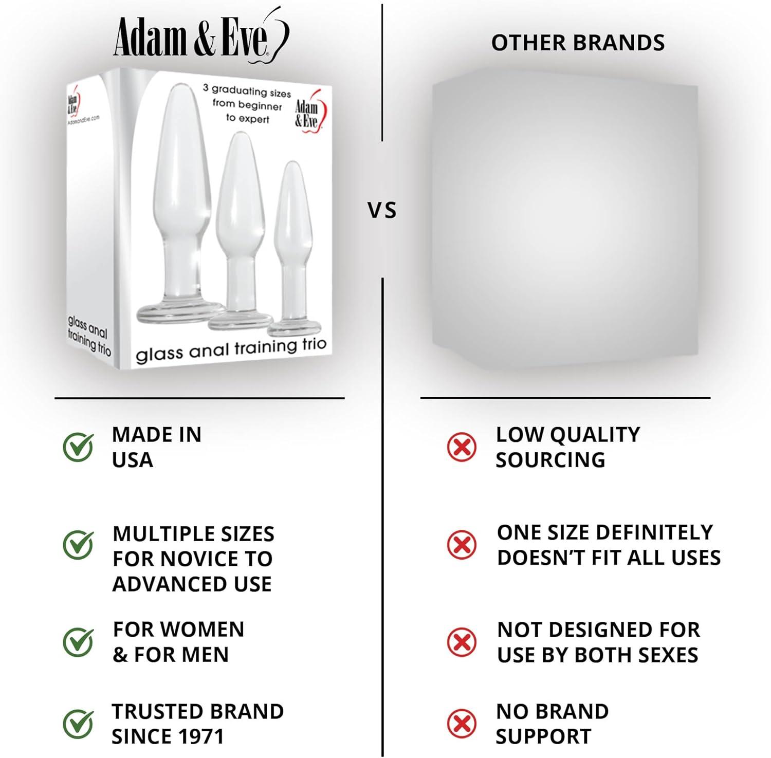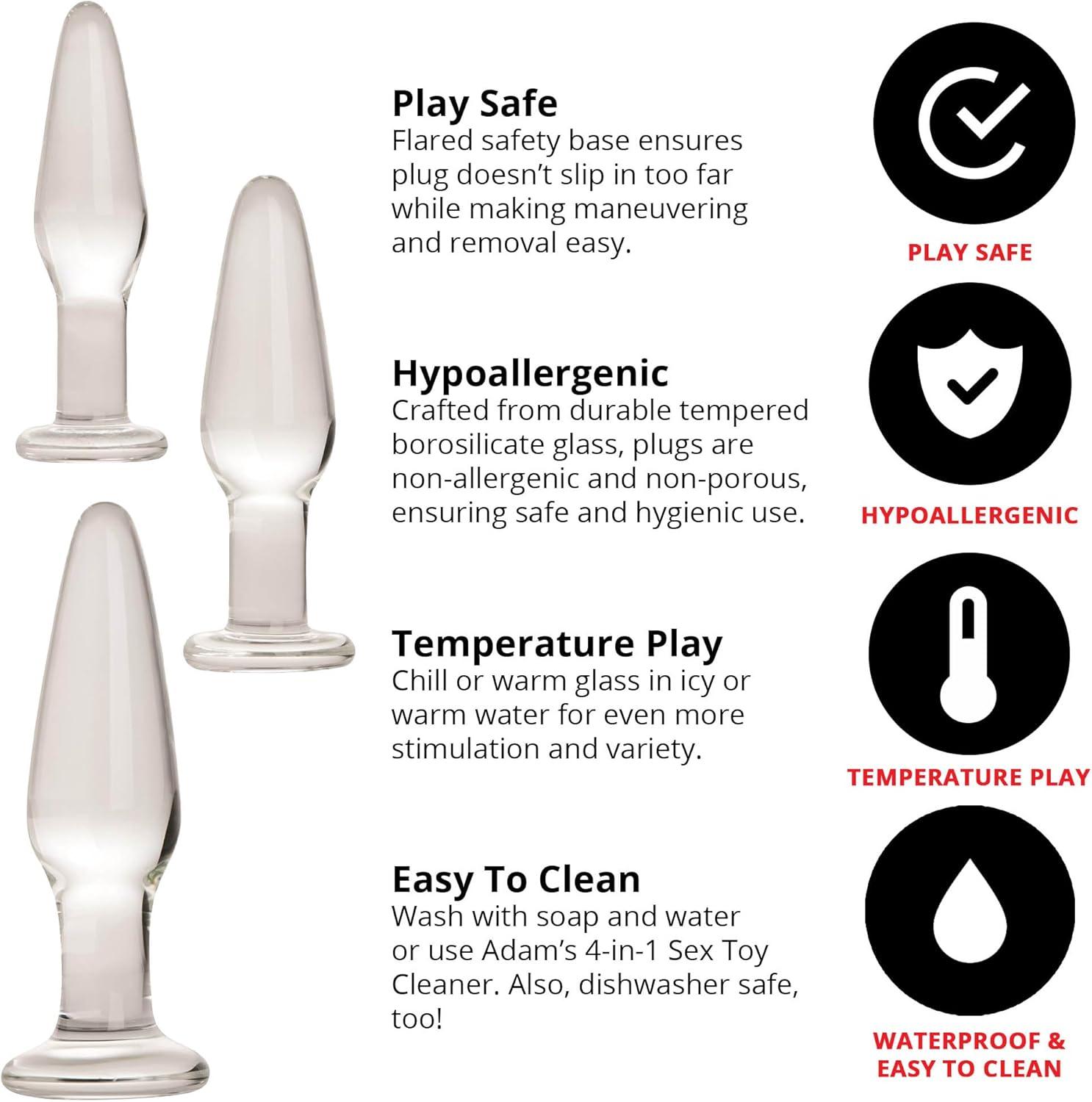 Adam and Eve Glass Anal Plug Set of 3, Hypoallergenic Non Porous Butt Plugs, Smooth Tempered Borosilicate Glass for Backdoor Training and Temperature Play, Small Medium Large Sizes for Women and Men