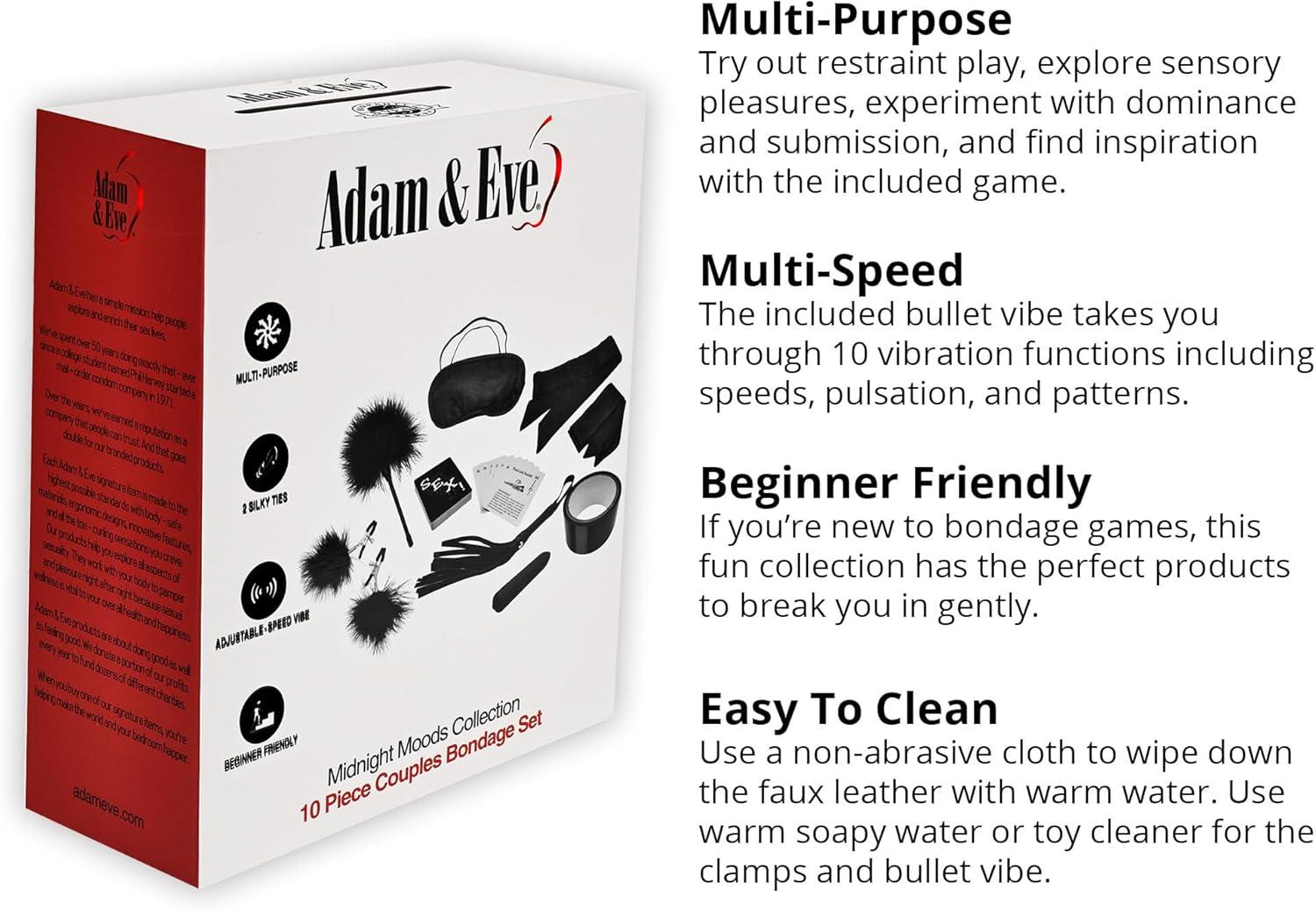 Adam & Eve Midnight Moods Bondage Collection, 10 Piece Bondage Play Kit with Satin Restraint Ties, Bullet Vibrator, Nipple Clamps, Flogger, Feather Tickler, Blindfold & Year of Sex Card Deck