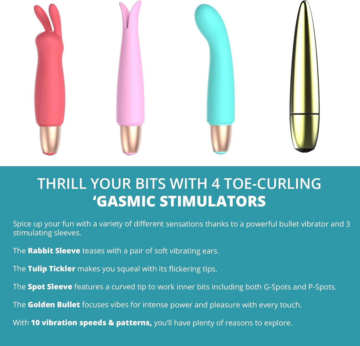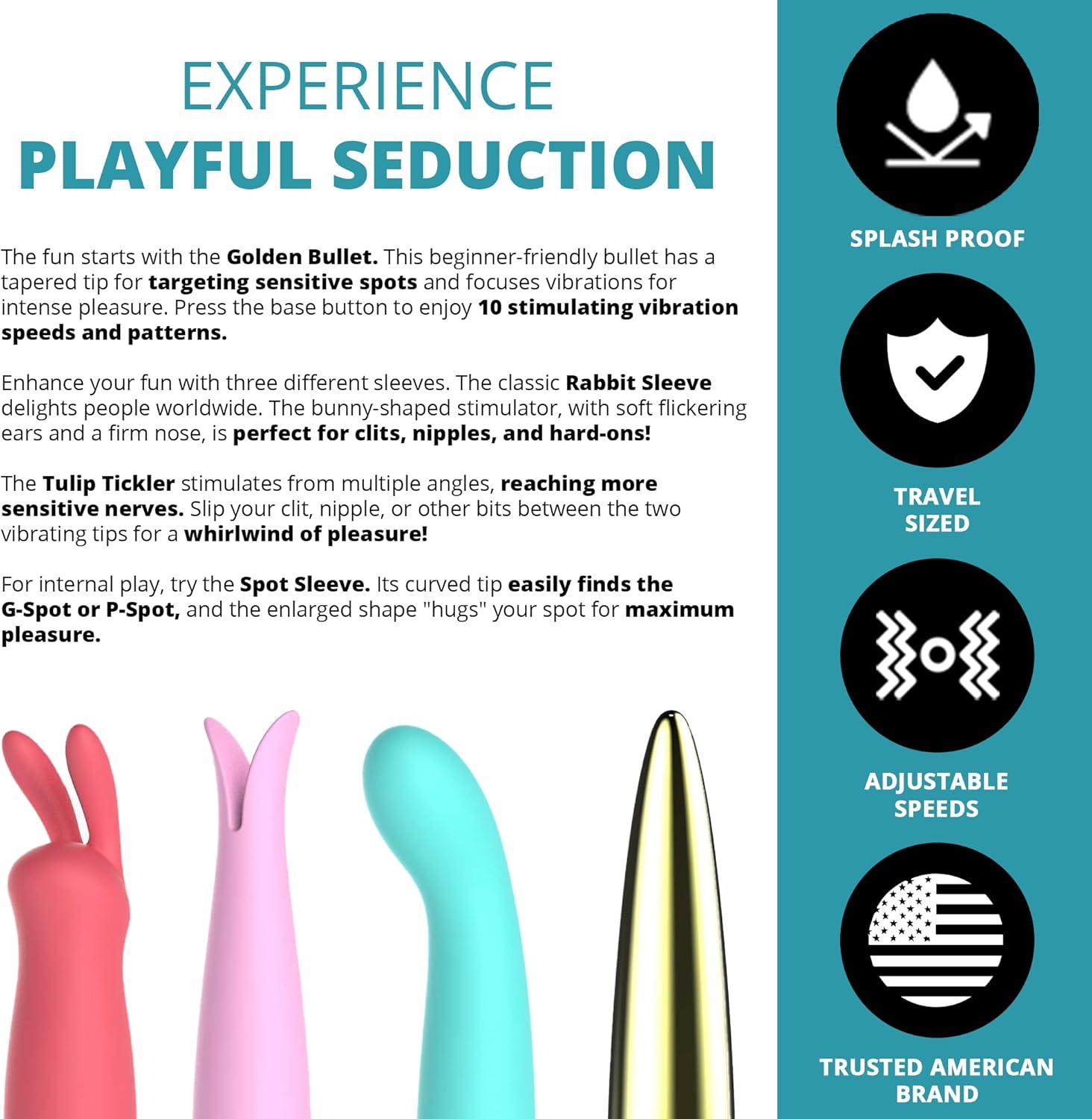 VERSATILE BULLET VIBRATOR WITH 3 STIMULATING ATTACHMENTS: The Adam & Eve Playful Seduction Kit includes a powerful golden bullet and three unique sleeves. Enjoy targeted pleasure with multiple textures and shapes designed to tease, tickle, and thrill your most sensitive spots
