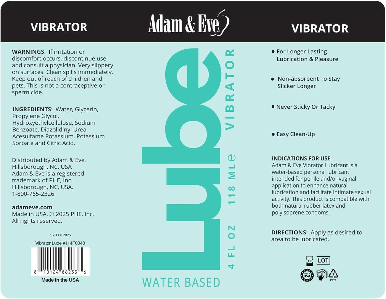 Adam & Eve Vibrator Lube 4oz Water Based Gel for Personal Massagers and Devices Gentle Non Sticky Unscented Formula Safe for Daily Use Compatible with Silicone Rubber Latex and Most Materials