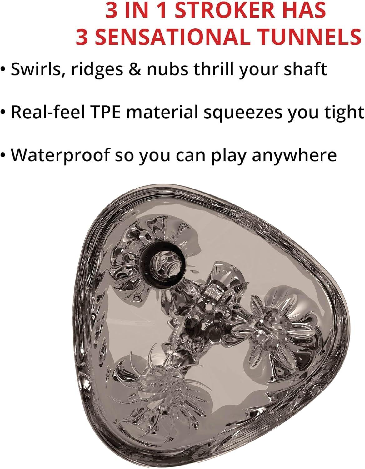 Adam & Eve 3 Way Stroker Real Feel Male Masturbator 3 Textured Pleasure Tunnels Waterproof Open Ended Stroker Soft TPE Ribbed Swirls and Nubs Tight Sensation Adult Toy for Men 5.5 Inches
