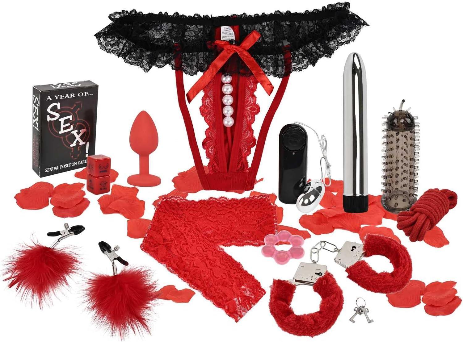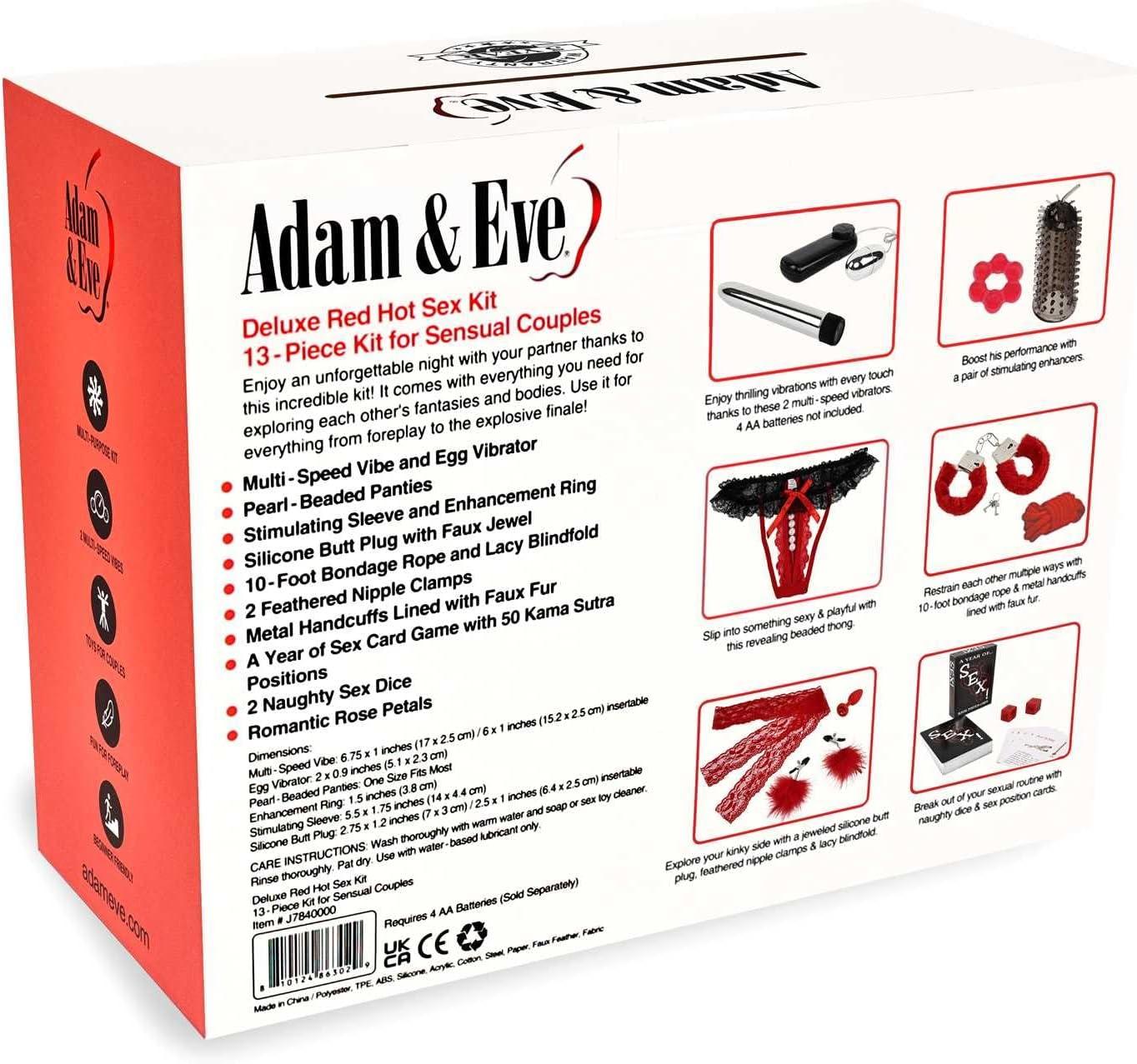 Adam and Eve Deluxe Red Hot Sex Kit, Couples Sex Toys Set with 13 Pcs, Bondage and Sex Toys for Games, BDSM Kit and Sex Toy Kit with Vibrators, Handcuffs, Rope, Nipple Clamps, Foreplay Accessories