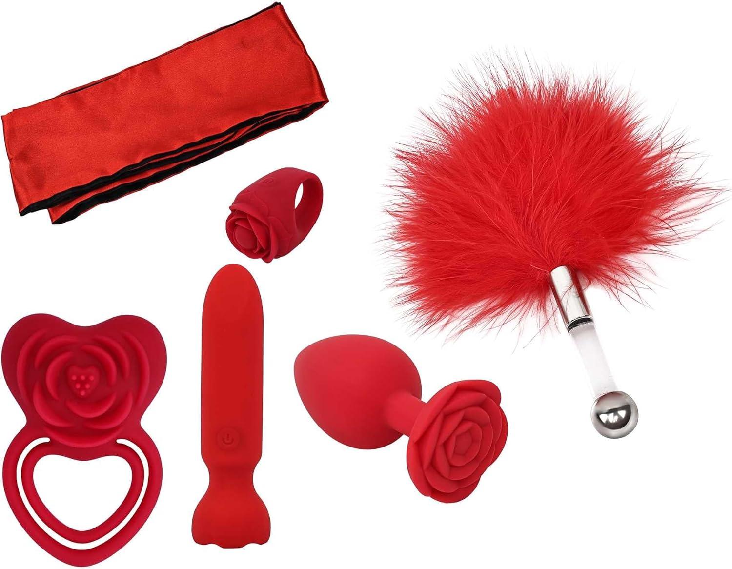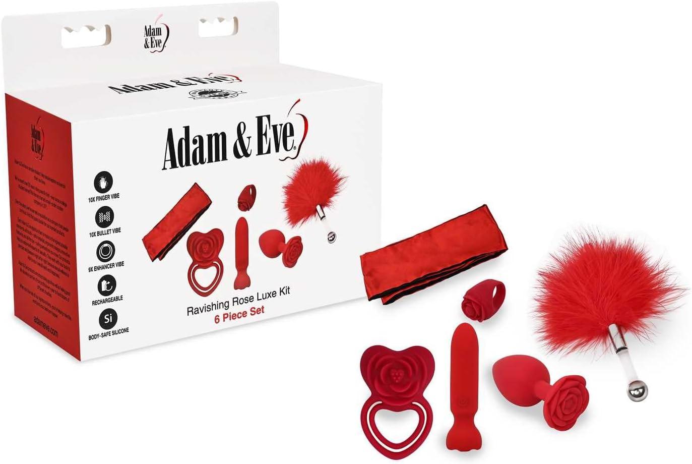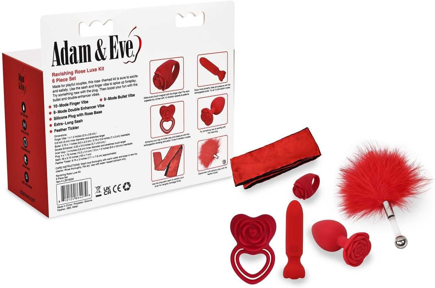 Adam and Eve Ravishing Rose 6 Piece Luxe Kit, Couples Sex Toy Set with Vibrating Finger Ring Bullet Plug and Penis Ring, Rose Themed Bondage Sash and Feather Tickler for Romantic Play